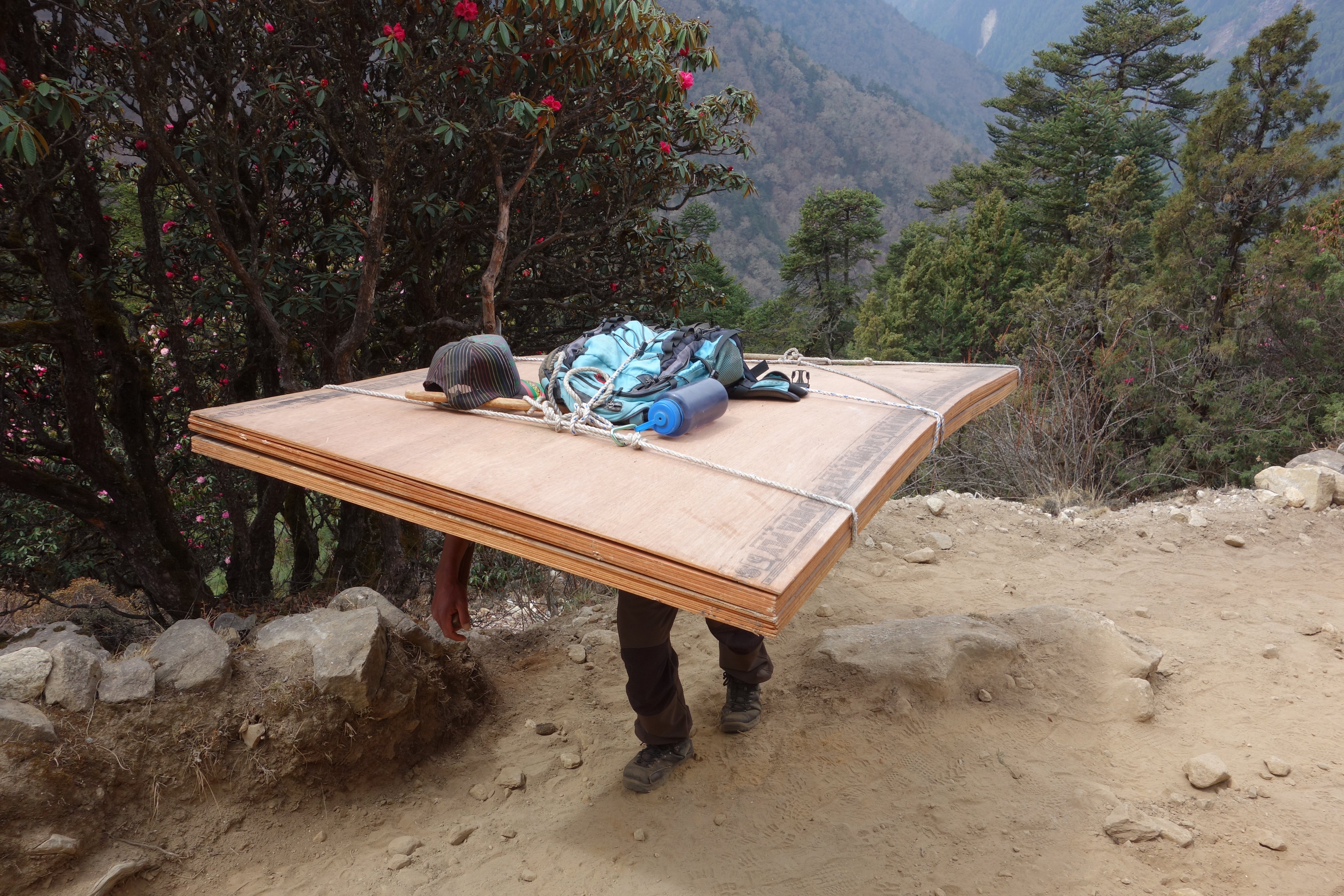 • Porters each shouldering several 4-by-8-foot plywood sheets for tent floors, together with 12-foot-long 4-by-4s for the foundations, so that Westerners could enjoy flat floors in their tents.