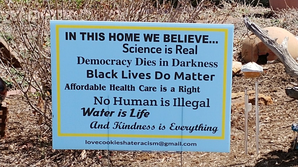On a recent walk, I came across a neighborhood littered with the yard sign in this photo. It seems the provocative platitudes we’ve seen on bumper stickers for a century have now taken root in our yards.