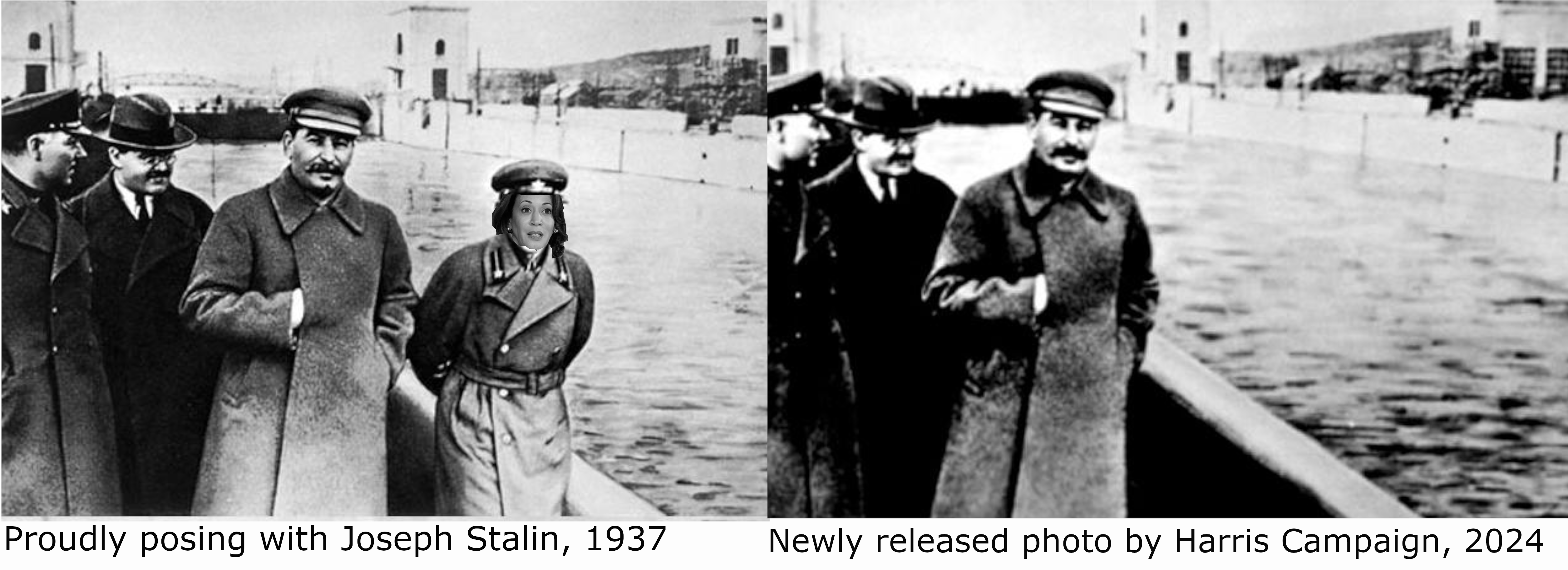 N.B. The photos are a play on a famous incident of revisionist history by another hard-left outfit, the Soviet Union. The person to the right of Stalin was not actually Kamala (whose face I’ve photoshopped in) but the head of the Soviet secret police. After he fell out of favor, Stalin instructed Soviet censors to doctor the photo to remove him.