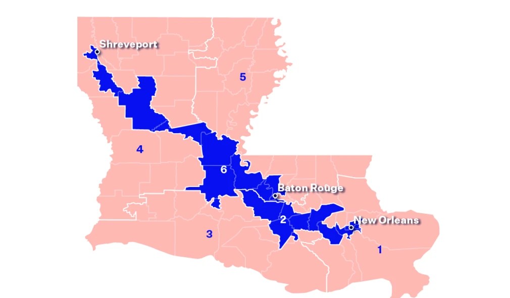They achieve this by drawing the Congressional Districts in such a way that Democrats have at least a small majority in every Congressional District. If a map shows a Republican majority in a district, then they shift the geographic boundary of that district to borrow from an adjoining district where the Democrat/Republican split is more favorable. The outcome can be weirdly-shaped districts, such as shown on the above map of Louisiana.